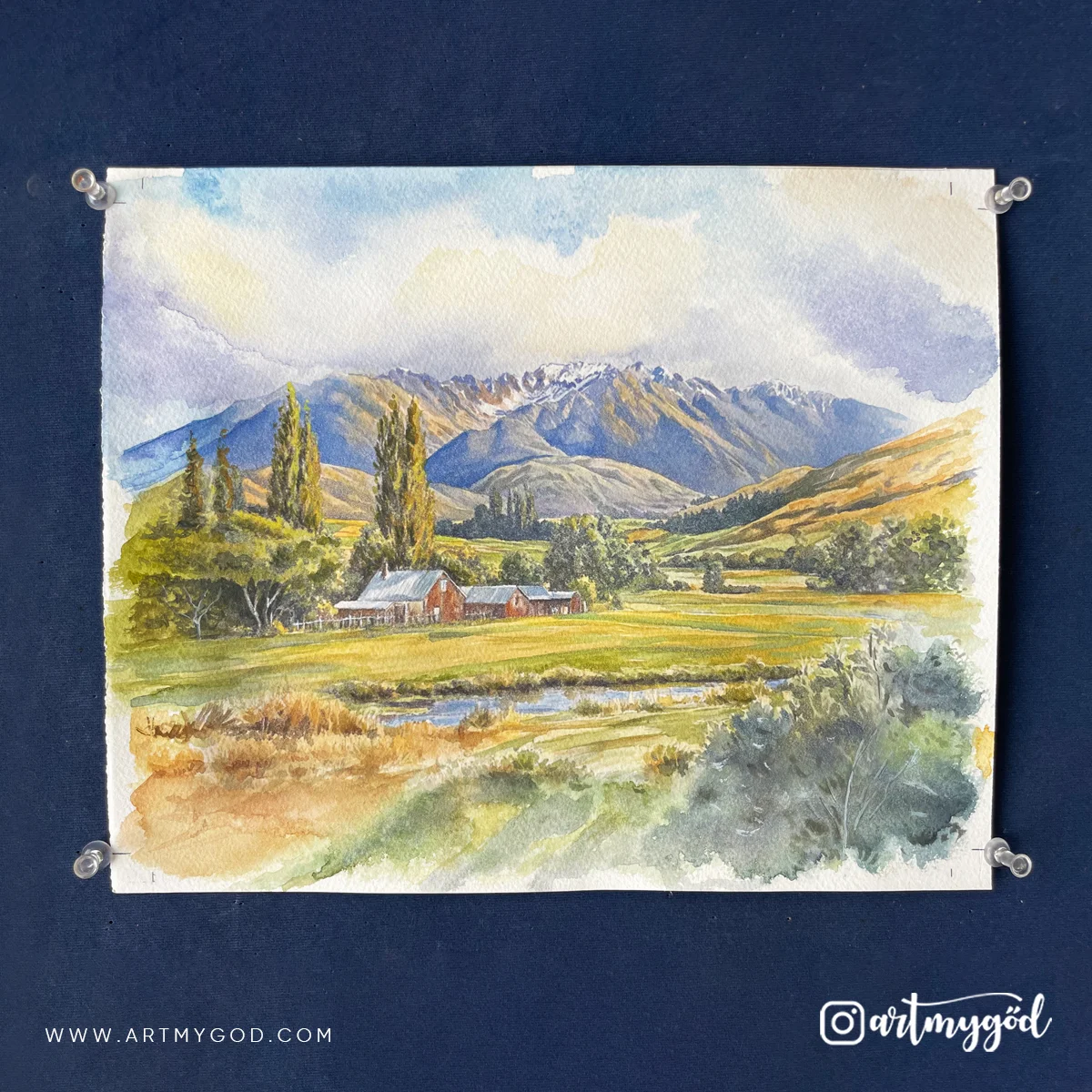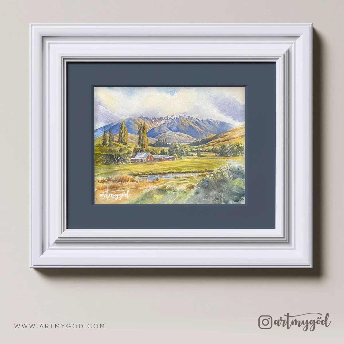 This artwork is painted using professional-grade watercolors on high-quality 300 GSM paper, ensuring long-lasting colors and fine texture. The detailed rendering of the farmhouses, trees, and distant hills adds depth and realism, making it an eye-catching centerpiece for your home or office.